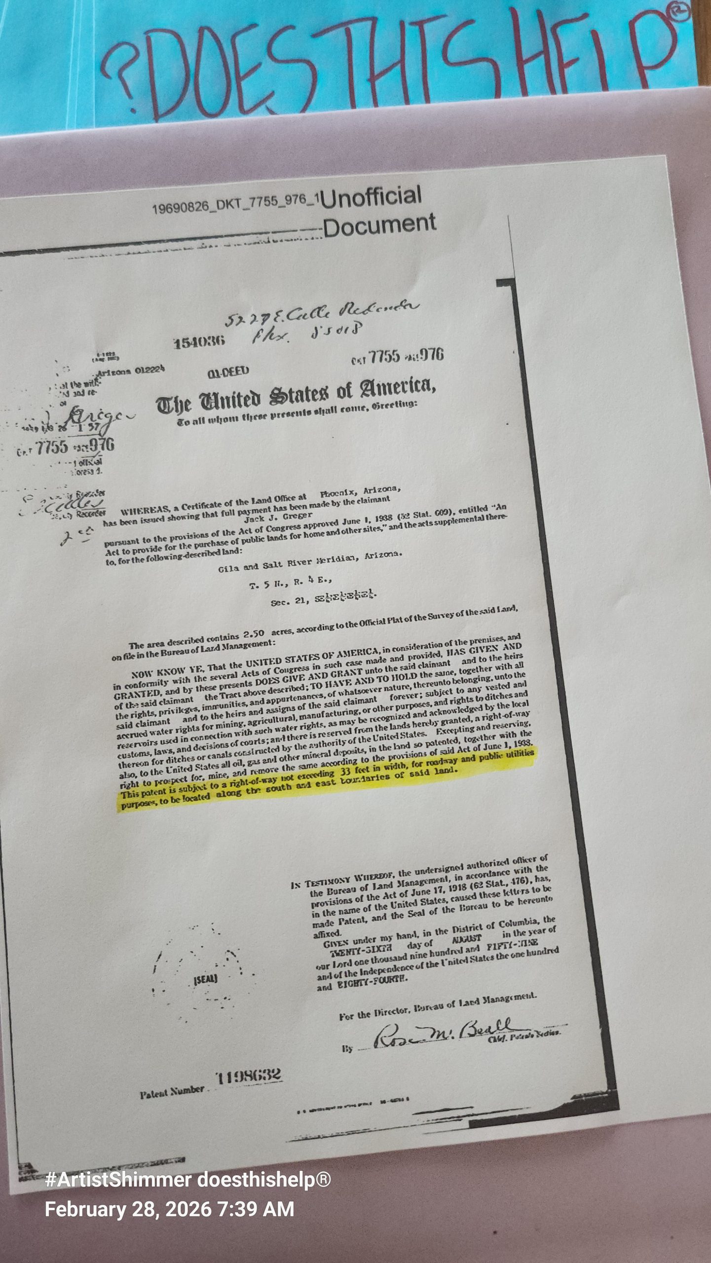 DOES THIS HELP® the timeline est. August 26th, 1959 Jack J. Greger, U.S. Veteran Granted from the United States of America U.S. Land Patent Number 1198632 2.50 acres at Gila and Salt River Meridian, Arizona. (Maricopa County) T. 5 N., R. 4 E. Sec. 21, SE¼,NE¼,NE¼,N¼ (NW Corner of Rancho del Oro & 64th Street, … Continue reading GREGER